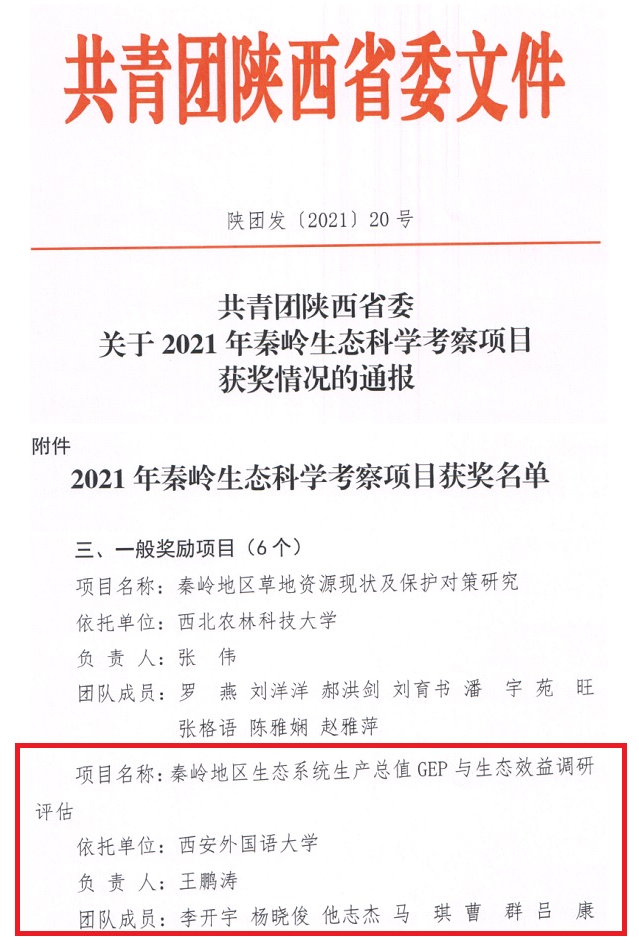 王鹏涛老师在校团委支持下,将专业教学与科研实践相结合,持续推进秦岭生态环境保护相关研究与实践工作,申报选题《秦岭地区生态系统生产总值GEP与生态效益调研评估》,在生态系统服务研究视角下,精细化表征并核算区域生态系统供应品与服务供给能力,科学合理评估秦岭地区生态系统生产总值,并为秦岭地区生态效益评估提供科学参考。