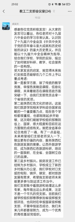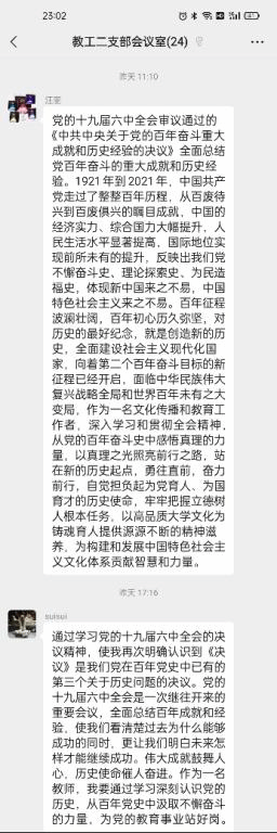 王晓华同志认真学习了文件,她表示要把学习宣传贯彻党的十九届六中全会精神作为一项重要政治任务,深入学习、深刻理解、准确把握,切实把学习成果转化为推进学校高质量内涵式发展的强大动力,坚定不移履行为党育人、为国育才使命。王莉霞同志表态,作为党员教师要从党的百年奋斗重大成就中汲取动力滋养,从党的精神谱系中锤炼担当品格,从党的宝贵历史经验中把握规律方法,切实把思想和行动统一到精神上来,真正做到学思用贯通、知信行合一,助力学生成长成才。辛建同志发言,在本职工作中务必做到“两个维护”,紧跟时代步伐完善自我建设,将课程思政与教学工作紧密结合,将理论与实践紧密结合,立德树人,守正创新。王鹏涛同志谈到,参与了全国青年环保组织骨干学习党的十九届六中全会精神专题培训班的体会,会议公报的发布,在全国包括我省生态文明建设及环保志愿服务领域引发广泛关注与探讨。作为秦岭生态青年学者,我校环保社团指导老师之一,将坚定前行,以奋斗之我推动秦岭生态文明建设。李开宇同志指出,作为高校教师和教学管理人员,必须要深入学习党的方针政策,加强自身党性修养,提高政治理论水平,坚持以习近平新时代中国特色社会主义思想为指导,坚持走中国特色社会主义文化发展道路,贯彻落实党的教育方针,坚持立德树人,为国家培养德智体美劳全面发展的社会主义建设者和接班人。另有多位同志也在微信群进行了踊跃发言与交流。