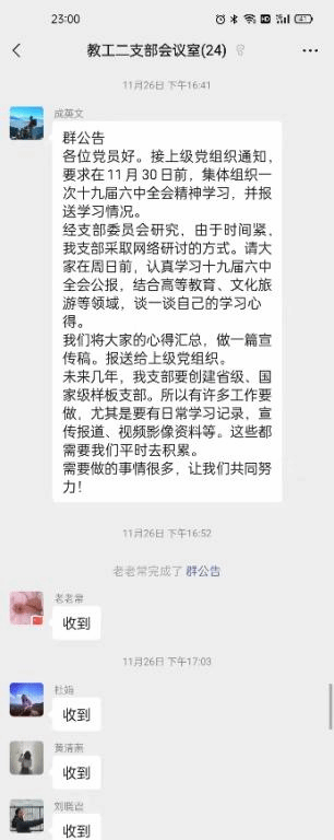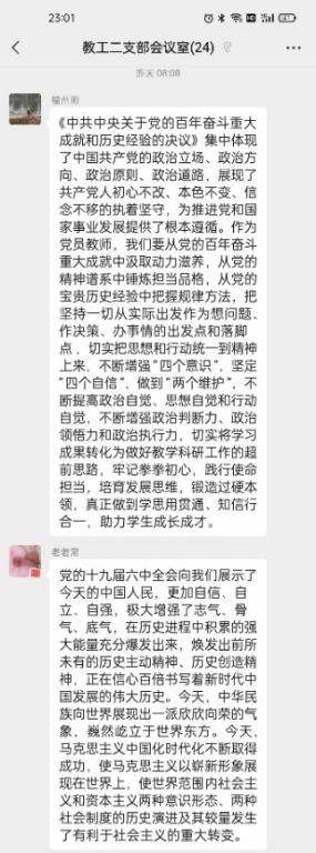 教工二支部积极利用微信群开展政治理论集体学习,支部党员全员参与,采用形式多样的方式,深入解读和学习党的十九届六中全会精神,并进行专题交流研讨。活动由好色网