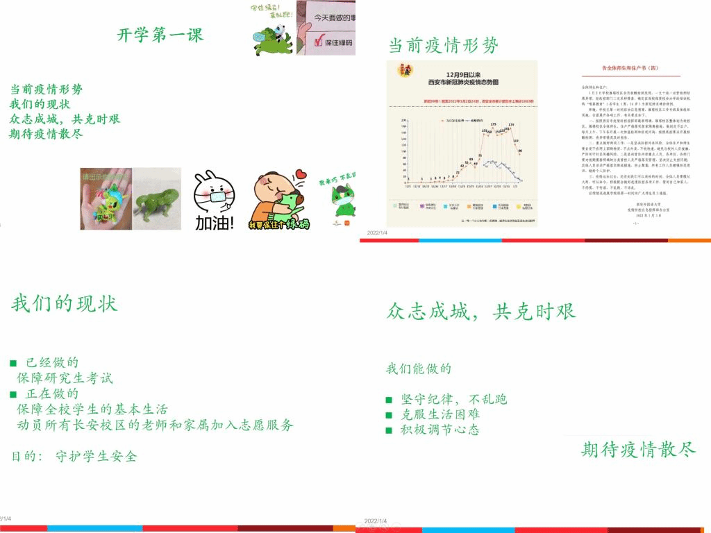 虽然2021-2022学年第二学期跟上学期无缝衔接,上课方式发生了改变,但丝毫没有影响老师和同学们的学习热情,全天线上教学工作有序开展,教学秩序平稳有序。有线上授课经验的杨军辉老师在课程直播开始时以“听不见扣‘1’”的玩笑开启了新学期的第一节《酒店管理概论》课。开课前,杨军辉老师首先讲述了自身的隔离生活。他表示生性活泼好动的学生每日被局限在6人的宿舍,产生不适和矛盾是可以理解的,但与奔赴抗疫一线的医生、警察和志愿者相比,“在宿舍”更是一种被保护的幸福。杨军辉老师希望同学们多多沟通、通过不同方式来缓解和调试,转变心态、认真学习、活在当下。《英语阅读II》授课老师龙湛在课程开始前跟向同学们分享了西安疫情的现状和雁塔校区的现状,以及雁塔校区被封控老师们对隔离学生的怜惜、包容和温情祝福,引导同学们坚守纪律、不乱跑、不信谣、不传谣。龙湛老师表示,新校区各级领导、教职工和教师家属志愿者在全力保障学生们的基本生活,希望同学们以积极心态,健康的身体共克时艰。2021级罗瑞林同学表示对全新的课程充满了期待。完全不同的课表还是会让她有一种新年新气象的感觉。最近在疫情下,网上教学全面实行,学院老师对同学们很关照,课堂气氛还是很活跃,每天身体在宿舍里,灵魂却在书海里,感觉挺充实的。