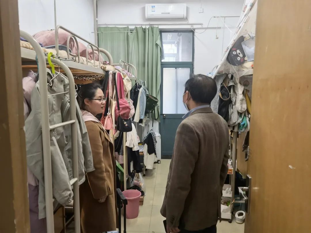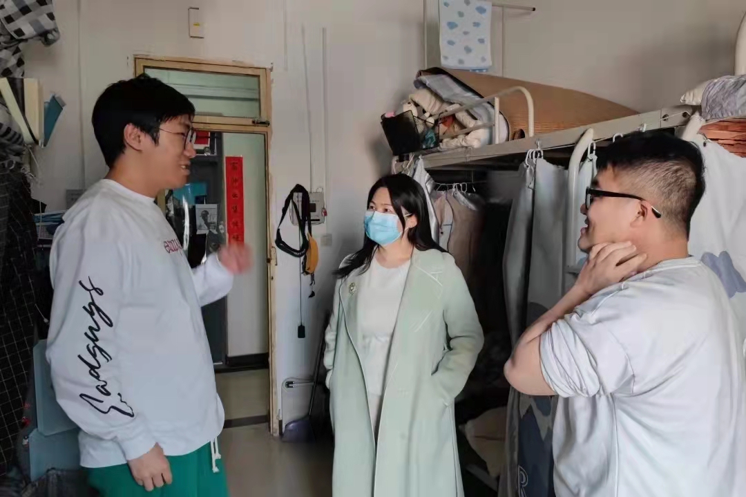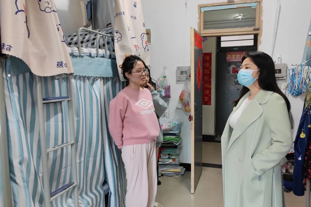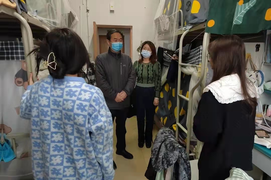 书记郭建平、院长李开宇、副书记上艳妮、以及辅导员高野、胡森文、焦议、秦怡深入学生宿舍走访看望学生,了解学生开学返校、学生宿舍疫情防控、宿舍卫生等情况。