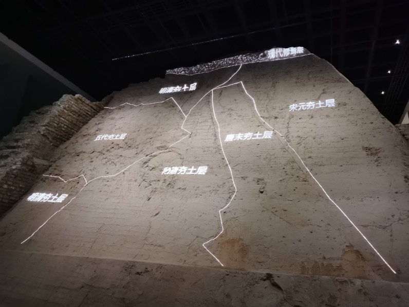 之后在西安唐皇城墙含光门遗址博物馆中,在城墙解说员的带领下,同学们先后见识了古时长安坊间文化格局图、城墙断面以及3D投影解说、过水涵道以及3D投影解说。