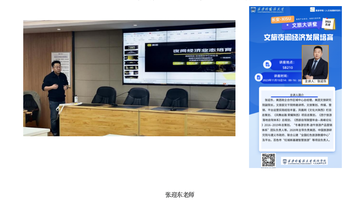 (人文地理研究所)主办的“长安-XISU文旅大讲堂”邀请美团政企合作区域中心总经理,美团文旅研究院副院长,文旅部特邀讲师张迎东老师于2023年11月15日下午在我校SB-210会议室开展主题讲座。讲座由黄清燕老师主持,全体旅游管理专业研究生共同参加。