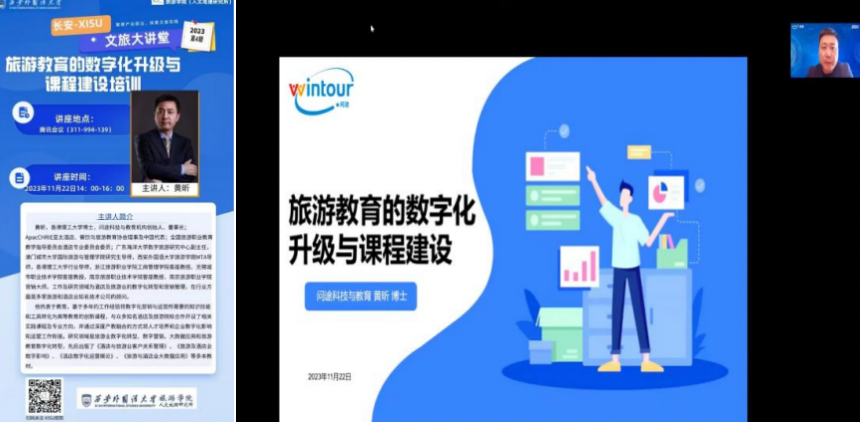 为贯彻落实立德树人根本任务,全面提高教师数字化。“长安-XISU 文旅大讲堂”2023年第4期特别邀请香港理工大学博士,问途科技与教育机构创始人、董事长,MTA导师黄昕博士于11月22日线上开展“旅游教育的数字化升级与课程建设培训”主题讲座。