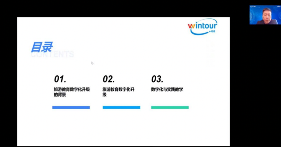 随后,他介绍了数字化课程的建设内容。数字化课程是指传统课程融入数字化内容,以及数字化运营方向的课程两大类,并需要结合数字化的教学模式和方法。他表示,数字化课程开发包括三个核心要点:案例数字化+项目数字化+数据课程化。应将产业数字化转型产生的新岗位、新知识、新技能等先进元素融入专业课程和实践教学中,并采用创新的数字化教学方法赋能课堂教学全过程,为建设数字旅游时代的新旅游类专业和新课程体系提供完善的技术与课程解决方案。