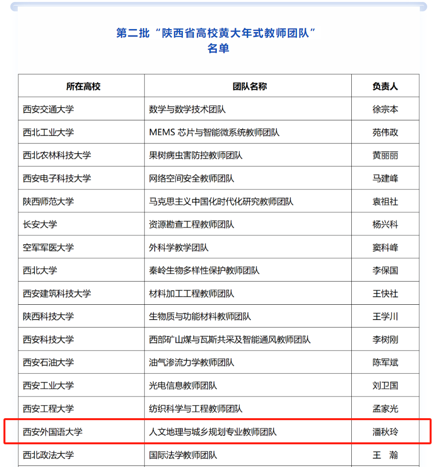 人文地理与城乡规划专业教师团队”一行名称如愿出现,与全省其他28个院校入选团队共称“陕西省高校黄大年式教师团队”,一切的努力与坚持都有了回答。