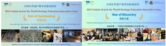 隋丽娜老师带领刘丹丹、王雪宁等研究生,与西安城墙景区联合申报的《遇见盛唐·探秘城垣:数字科技赋能西安城墙遗产教育系列活动》,以及与西安曲江艺术博物馆、西安皎皎白驹旅游有限公司、西安实践教育联合申报的《丝路丹青-中国古代壁画修复公众美育计划》分别荣获2024年“全球世界遗产教育创新案例-卓越之星”和“全球世界遗产教育创新案例-探索之星”。