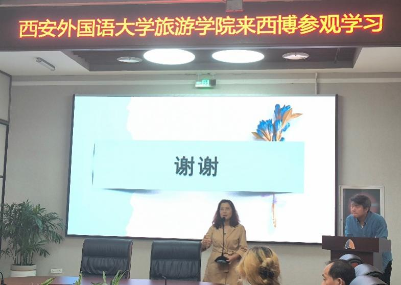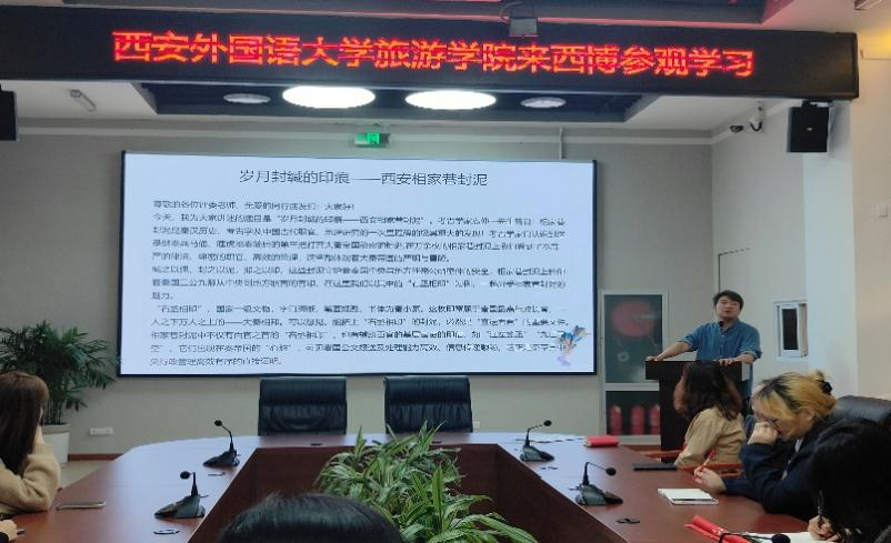 在西安博物院的会议室,陈慧老师对本次实习活动安排作以介绍,希望同学们抓住宝贵机会,认真学习积极探讨。旅英教研室主任杨国庆老师向同学们介绍了讲座专家教育推广部部长田继伟的学科背景和成果。田部长从事博物馆社会公共教育工作多年,曾获得西安市劳动模范、西安文博旅游推荐官、西安市文物局岗位服务标兵、陕西省十佳讲解员等多项荣誉,有中外政务接待和主持博物馆策展及导览线上直播导赏的丰富经验,并担任各类文博讲解比赛评委。田部长一直支持西外好色网
