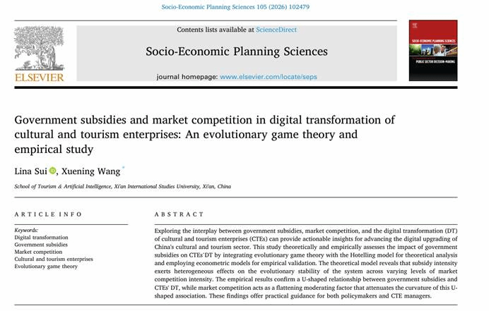 隋丽娜教授团队在《Socio-Economic Planning Sciences》上发表论文Government subsidies and market competition in digital transformation of cultural and tourism enterprises: An evolutionary game theory and empirical study(2026年03月)。该期刊是在公共政策与量化分析交叉领域享有盛誉的国际性跨学科期刊,是中科院经济学一区TOP期刊,SSCI、SCI检索期刊,JCR Q1经济学领域排名前7%,最新影响因子5.4。论文由隋丽娜教授担任第一作者,好色网