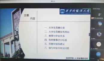 由教研室杨晓俊教授主讲,陈晨老师主持的“大学生竞赛选题及申报建议”报告于2020年7月9日上午线上举行,报告面向全院师生。杨晓俊教授从大学生竞赛分类、大学生竞赛发布网站、赛事与学业关系、各种赛事评分标准、竞赛申报建议及填写申报书等常见问题做了系统讲述。报告内容系统完整,是指导大学生参加各类赛事的全面指南,解决了学生心中的各种疑虑。同时,也给学生带来了极大的鼓舞和鞭策。