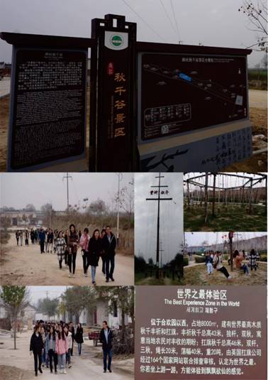 合阳黑池镇南社秋千始于宋、完善于明、兴盛于清,是集游戏与体育融合一体的民间技艺,至今已有千余年历史,2011年南社秋千被列入陕西省非物质文化遗产名录。景区内全长1公里左右,内有各式秋千百余种,三位老师和同学们深入景区,参观与体验秋千文化。同学们观察到秋千的取材,都是当地居民利用生活用具采用流传下来的木头嫁接术、铁匠包扎技术等制作完成,均赞不绝口。园内有高达46米的扛旗秋千,已被认证为世界最高的木质秋千,伴随着欢声笑语,师生们共同体验游憩了各式各样的秋千,愉悦身心,锻炼身体,营造出欢乐、热闹、和谐的实习氛围。大家一致认为乡村休闲娱乐是乡村文化旅游发展的重要手段与途径,并深入思考乡村传统文化传承保护与文化产业发展的矛盾与突破。
