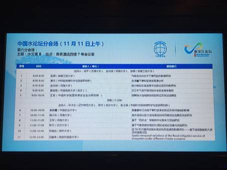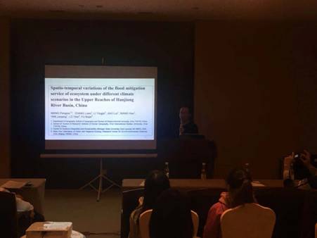教师王鹏涛积极参会并申请分会场报告,在11日大会第六分会场(水灾害专题会场)宣讲了生态系统服务的主题报告,报告题目为:Spatio-temporal variations of the flood mitigation service of ecosystem under different climate scenarios.