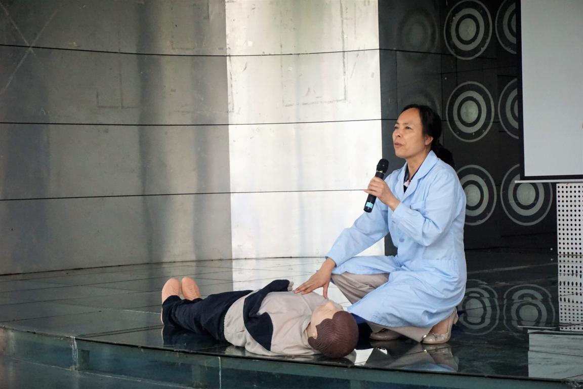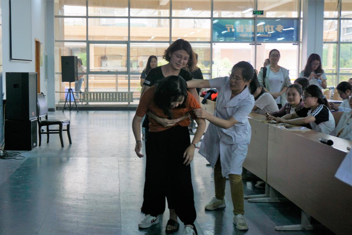 最后医生们又为大家演示了当气管卡有异物时应当如何实施救援。