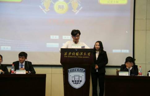 中文辩论队副队长彭祖沛。本次比赛邀请了2017级各专业同学以及部分2016级旅游英语班同学到场观摩。
