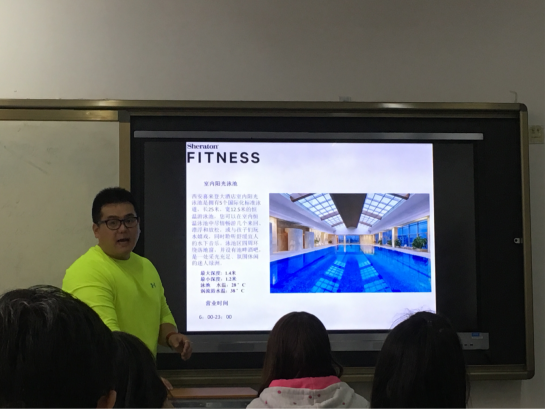 讲座中,殷经理依据多年的行业从业经验告诉同学们,高星级品牌酒店的顾客普遍对健身设施有很大的需求,而伴随科技的发展和健身器材的日益现代化,顾客高品质的健身需求也得到了很大的满足。目前,酒店为顾客提供的健身设施主要为健身房和游泳池,但各个酒店的具体设施往往都有其自己的特色。如西安喜来登酒店的游泳池采用了水下立体环声设备,使顾客在游泳时可以听到来自泳池底部的音乐。同时,喜来登酒店的水疗健身俱乐部也为顾客提供多样而健康的饮食服务。另外,殷经理也通过喜来登酒店和威斯汀酒店的对比为同学们详细地介绍了酒店的SPA服务项目,让同学们了解到了SPA服务中的精油选择也是一门重要的学问。最后,殷经理通过一个简短的运动视频告诉大家国内外的健身市场非常庞大,并鼓励大家积极参与到健身中去。