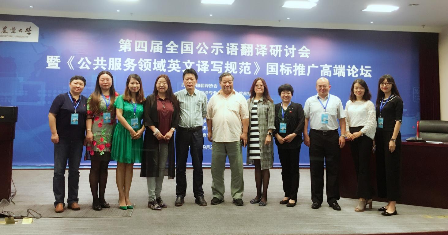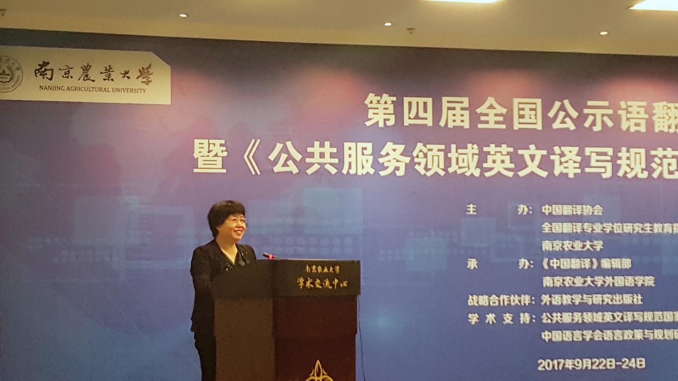 杨红英、陈慧、苏晓智、黄文英四位老师赴南京农业大学参加了由中国翻译协会、全国翻译专业学位研究生教育指导委员会和南京农业大学联合主办的第四届全国公示语翻译研讨会暨《公共服务领域英文译写规范》国标推广高端论坛。杨红英教授受邀大会发言,并主持分论坛。其余三位老师也宣读了自己撰写的论文,其新颖选题与丰富例证引起同行关注。参会老师均为好色网