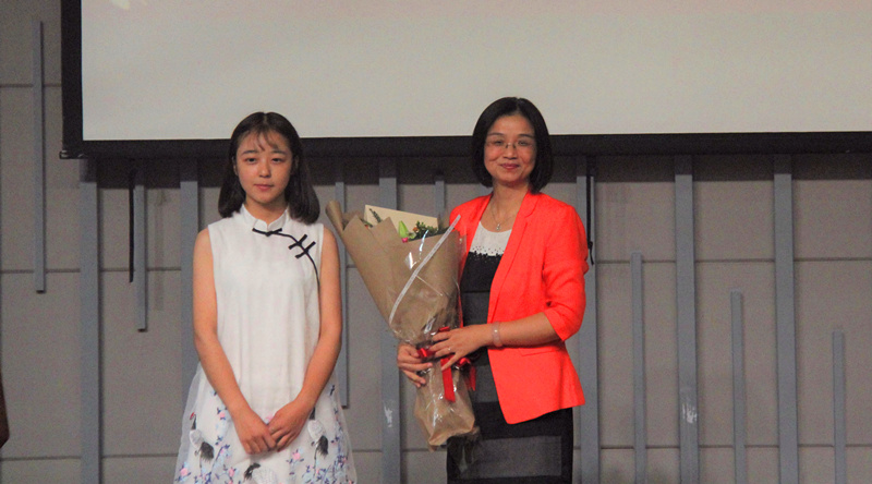 待潘院长讲话完毕,学生代表康洁上台献上鲜花和祝福,表达出我们对老师深沉的敬意和感激。