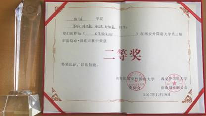 英语专业2015级郑献霖、陈佳鑫、李明月同学和旅游管理专业2016级周佳滢同学设计的作品“移动应用软件在汉长安城保护开发中的应用:长安游你APP”,历经院级选拔、初赛评选、复赛现场展示和线上投票等层层选拔,入围决赛,最终获得大赛二等奖。