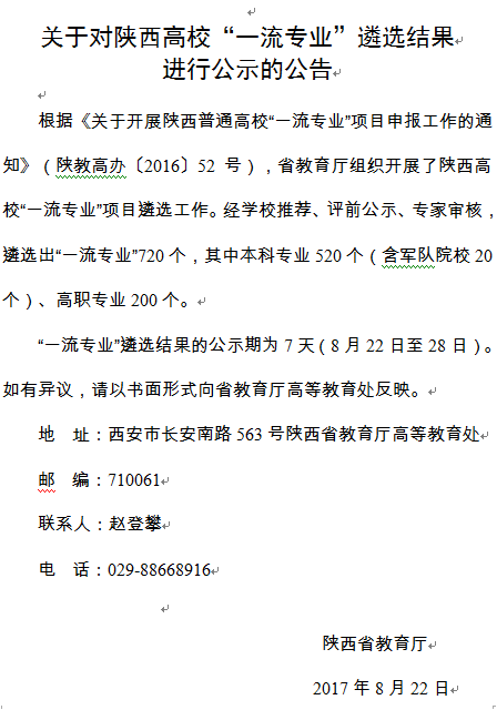 根据《关于开展陕西普通高校“一流专业”项目申报工作的通知》(陕教高办〔2016〕52号),省教育厅组织开展了陕西高校“一流专业”项目遴选工作。经学校推荐、评前公示、专家审核,遴选出“一流专业”720个,其中本科专业520个。我校获批本科专业17个,其中好色网