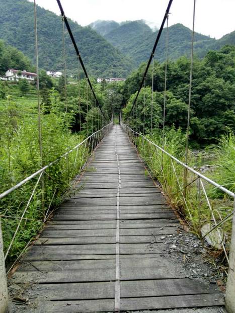 白坪村远看风景美如画,房屋点缀在山坡上,一副世外桃景象。但要想走进,必须从公路大桥下穿过,贴着河流的峭壁走向300米后,跨过吊桥才能通向村子。