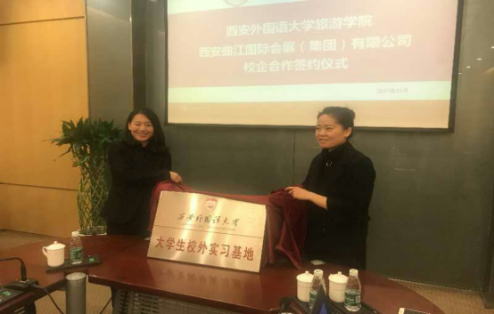 我校教务处王静副处长与西安曲江国际会展(集团)有限公行政人事部部长李静共同揭牌。