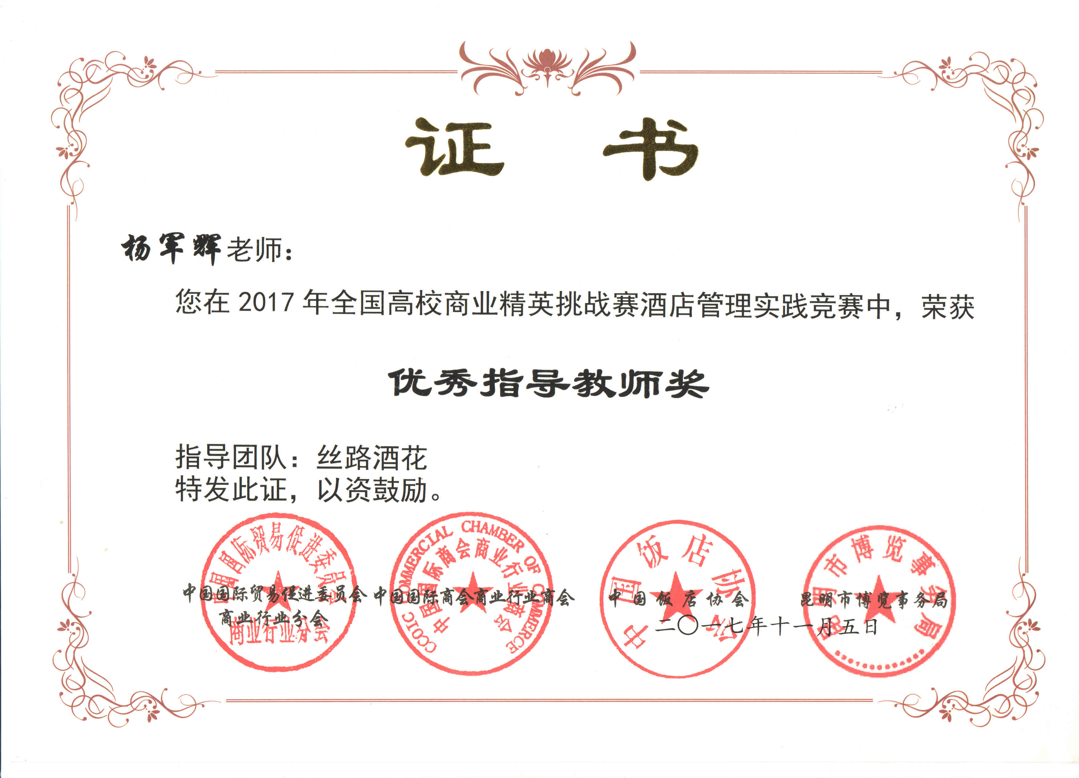 2015级酒店管理专业王叶子、毛紫薇、杨骋等三名同学,在杨军辉老师的指导下组建“丝路酒花”代表队参加了酒店管理实践组的总决赛。
