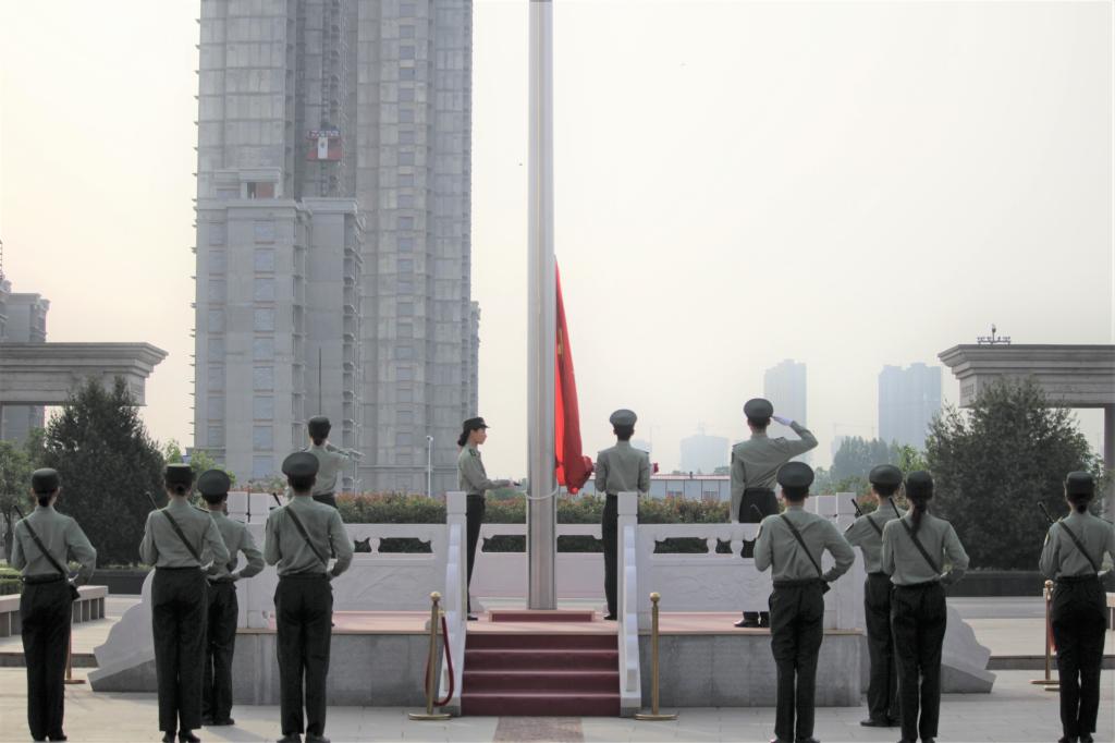 全体观礼师生端正肃立,向国旗行注目礼并高唱国歌。全体师生凝视着迎风飘扬的五星红旗,心中无比自豪。礼毕,国旗护卫队退场。