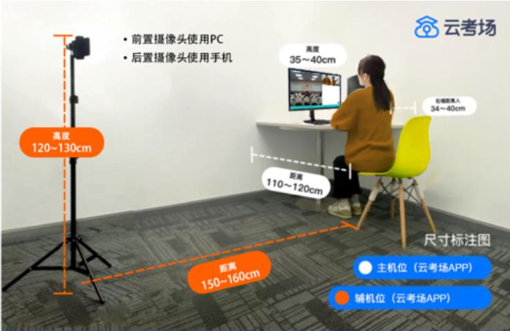 2. 网络远程复试示例如图所示,主副机位均应正确摆放。进入考试房间,考生二机位摆放在考生的右后方(或左后方)距离考生1米左右,45°拍摄,且二机位须拍摄到考生一机位的画面、考生双手摆放位置及考生周边环境。考生的第一机位不可用平板登录。建议考生第一机位使用笔记本电脑,利用手机支架架设第二机位。