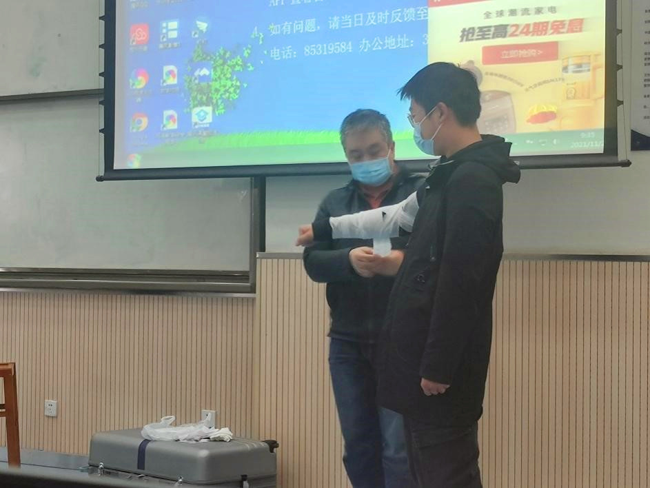 在最后现场实操环节,孟院长及校医院赵医生向大家展示了八字环绕包扎法、用人体模型为大家讲解和示范了心肺复苏的具体操作步骤,并对上台学习演练的学生进行现场指导,锻炼同学们的实际操作能力。