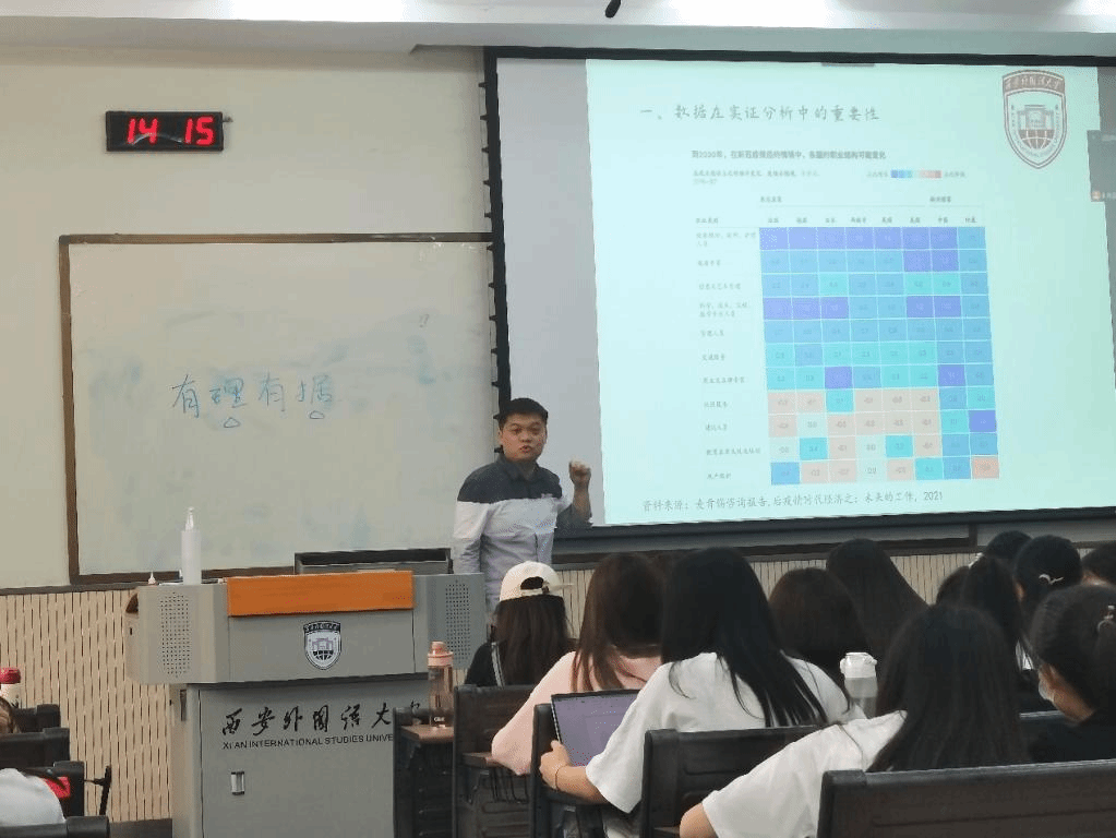 讲座伊始,陈乐老师通过向大家提出问题的方式引出课程内容,从论文撰写中的图片排版问题、学生小组参赛时PPT的制作、网页宣传、微信推送等方面解释数据在实证分析中的重要性;从宏观数据、微观调查数据、爬取数据等数据的来源向同学们展示了获取数据的手段方式;通过认识数据、清洗数据、数据可视化三个阶段向同学们讲解如何开展数据分析以及如何通过数据包络法深入分析数据。