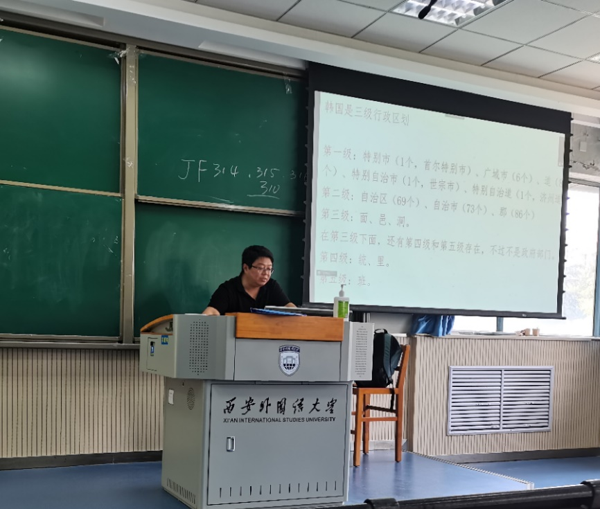 讲座伊始,吴海利老师从韩国的地形、气候、平原、河流、岛屿等方面对韩国的自然地理进行了详细讲解和介绍。接着老师给同学们介绍了韩国的历史发展、外交关系、国家政治等内容。从古朝鲜历史讲到了韩国的现代史,其中包括韩国的民族形成,行政机构等。
