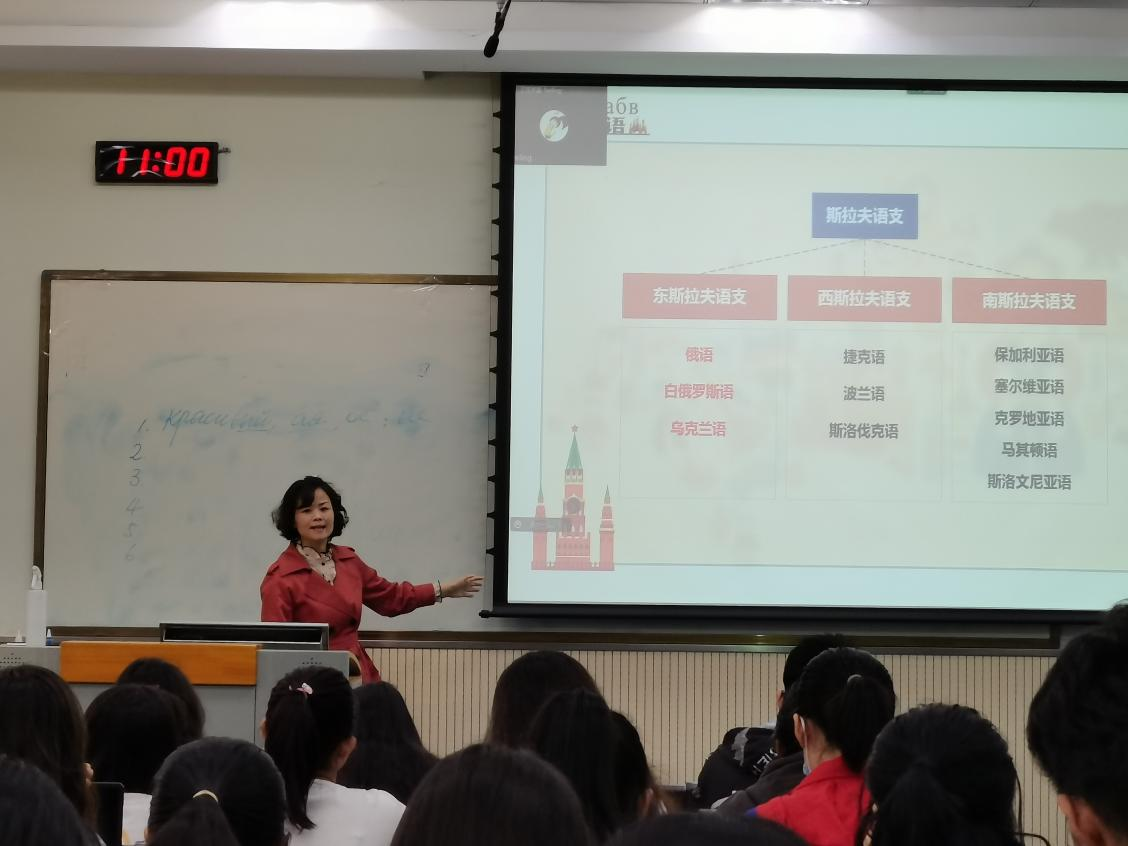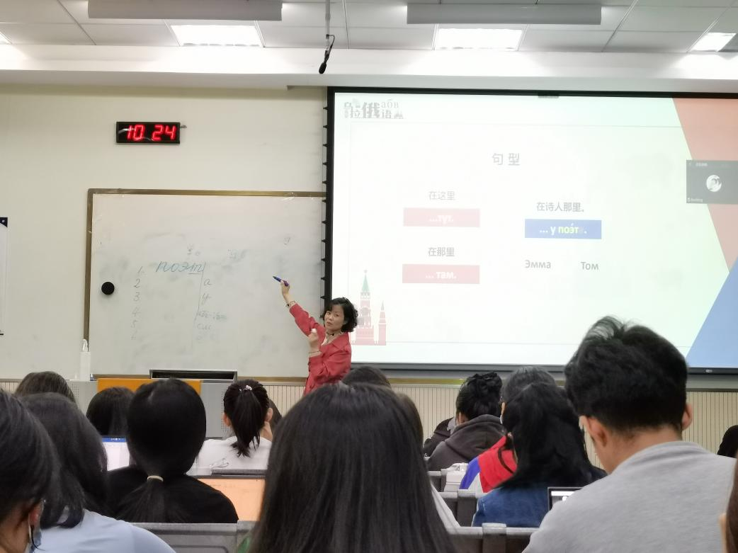 本科生学术创新与教学实践周教学实践活动的一部分,旨在向全体本科生们介绍俄罗斯的文化与国情,拓宽学生们的视野,增长学生见识。在这次活动中,徐老师先是给同学们介绍了一些俄语基础的入门词汇、句型并进行了语言训练。接着,徐老师与同学们共同歌唱优美动听的俄罗斯著名歌曲《喀秋莎》,并讲述了许多俄罗斯的音乐故事。同学们积极参与其中,在悠扬的音乐声中领略了俄罗斯的激情,全场气氛十分融洽热烈。