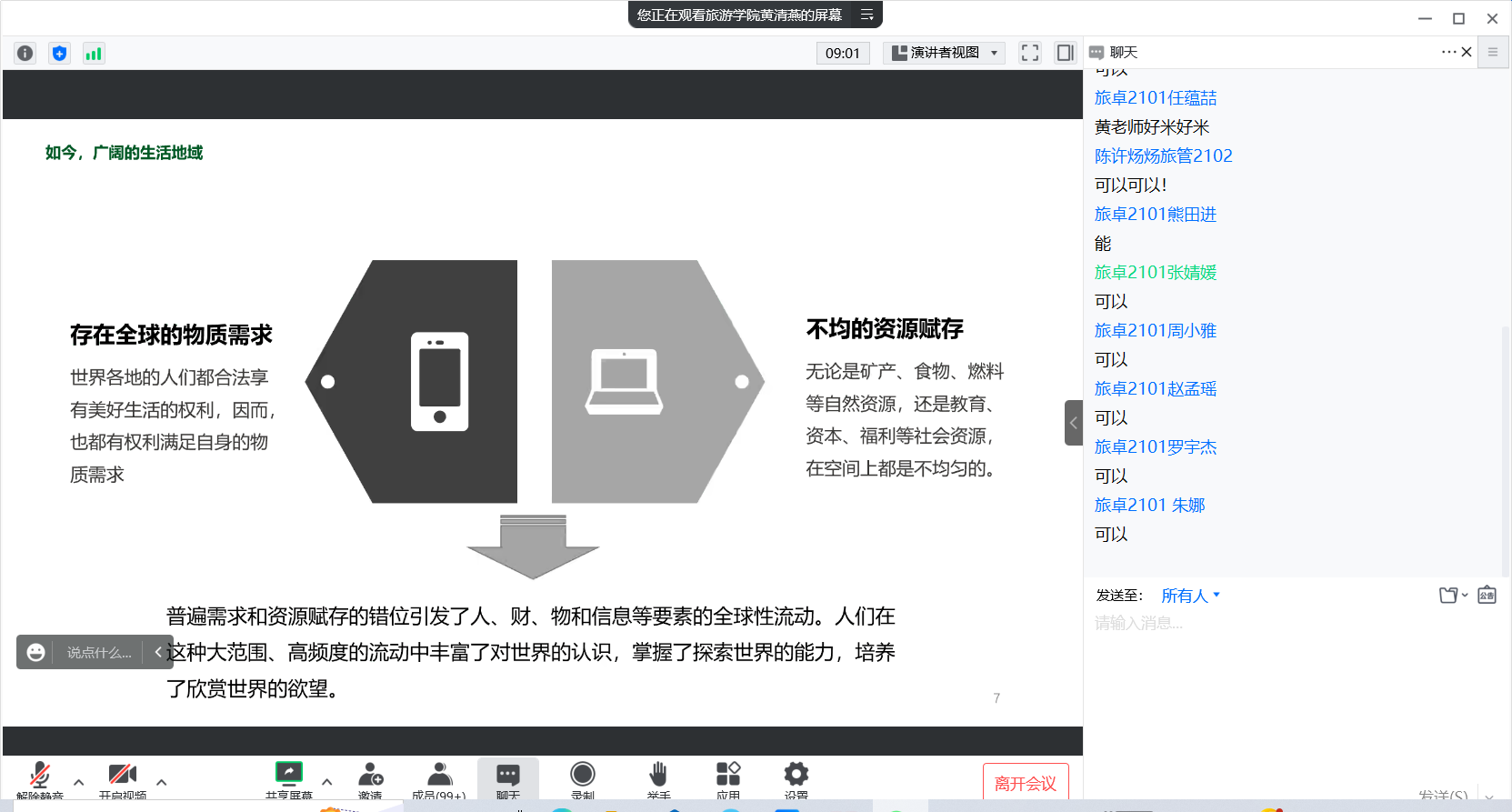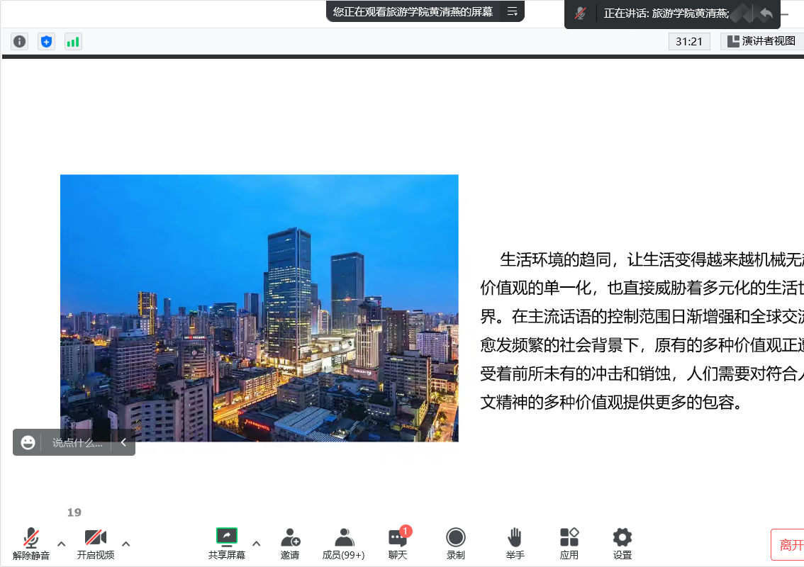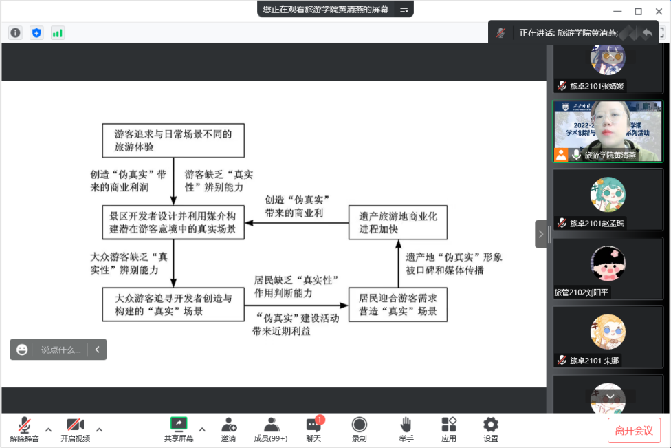 黄老师以段义孚先生的“逃避主义”,解构了现实生活中旅游的动机与行为表现。并引导学生们思考旅游与自我、生活、社会乃至人类发展的价值所在,启发学生们思考现实背景下旅游如何去传递和实现人本价值、健康价值、幸福价值,有效衔接人们美好生活的需要。