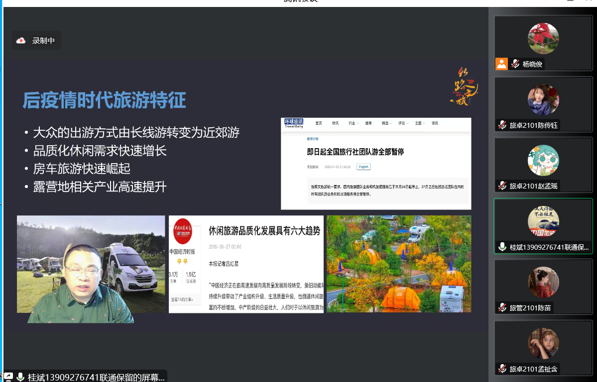讲座伊始,桂斌老师从“以扩大内需为战略基点,立足国内大循环,促进双循环”的自驾旅游国家层面背景和“自驾游占比提升,十四五旅游业发展规划,房车露营快速增长”的旅游层面为切入点,对自驾游及房车露营的发展历程进行了梳理和介绍。
