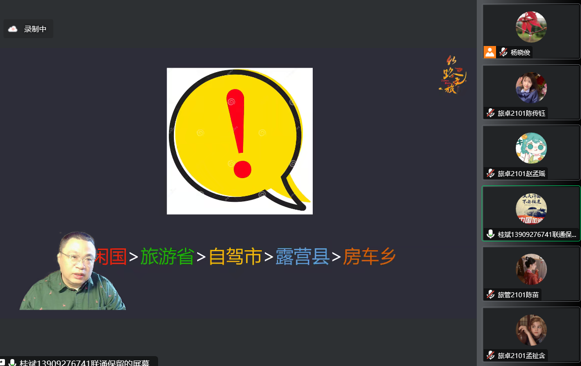 随后,桂斌老师对房车类型及消费人群、市场影响力等进行了针对性的介绍,特别是和旅游专业有关的自驾游及房车露营与众多旅游产业的融合,旅游服务对象、类型和服务收入方面进行深入讲解,指出自驾游及房车旅游如何在OTA冲击之下找到自身清晰的定位。