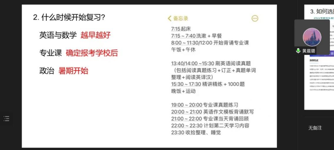 此外,黄晨璐老师进行了补充说明并分享了自己考研备战时的时间表供学生们复习参考。最后,有同学询问了老师考取本校研究生的难度。老师指出,本校考生仅资源相较于外校考生更加丰富,并不会更为容易,也同样需要非常认真的复习,且复习一定要全面,通透。