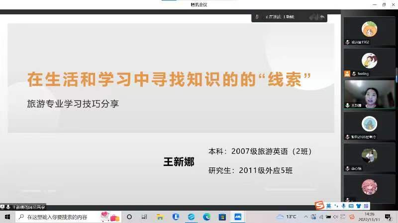 旅游相关专业的同学们更好地学习专业课程、提升专业素养、充实自我,学院邀请了2007级旅游英语专业优秀毕业生王新娜学姐,为同学们带来主题为“在生活和学习中寻找知识的线索——旅游专业学习技巧分享”的讲座。讲座于2022年11月11日下午以线上的方式成功举办。本次讲座由王新娜学姐主讲,张芒老师主持,好色网