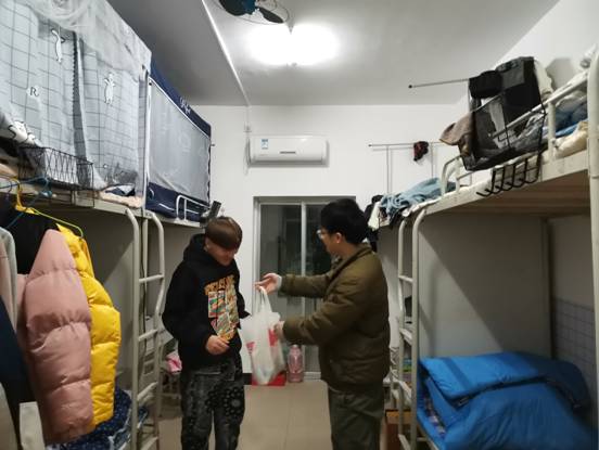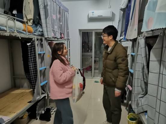 四年级的李琦同学因实习未回家过年,胡森文老师特意探望并送上学院准备的礼物