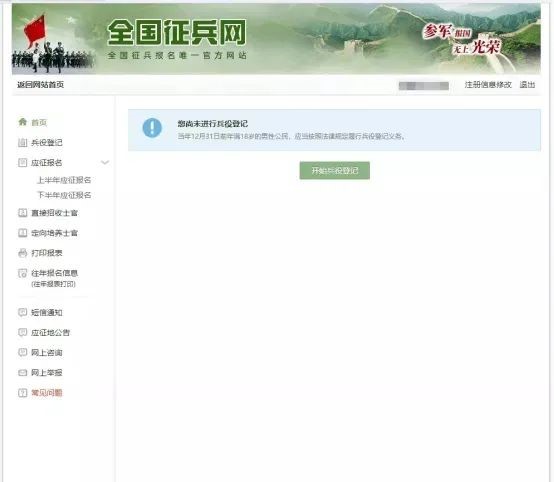 3.登录系统后,点击“开始兵役登记”。按照网页提示,填写个人信息,点击“提交”,完成兵役登记。