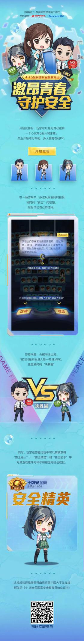 2021年4月15日是我国第六个全民国家安全教育日。为进一步普及国家安全知识,中国大学生在线与腾讯公司共同举行“激昂青春·守护安全”全国高校学生国家安全知识线上竞答游戏活动。竞答活动从总体国家安全观出发,覆盖了包括国家安全法、网络安全法等多个主题内容,题目由易至难梯度进行。