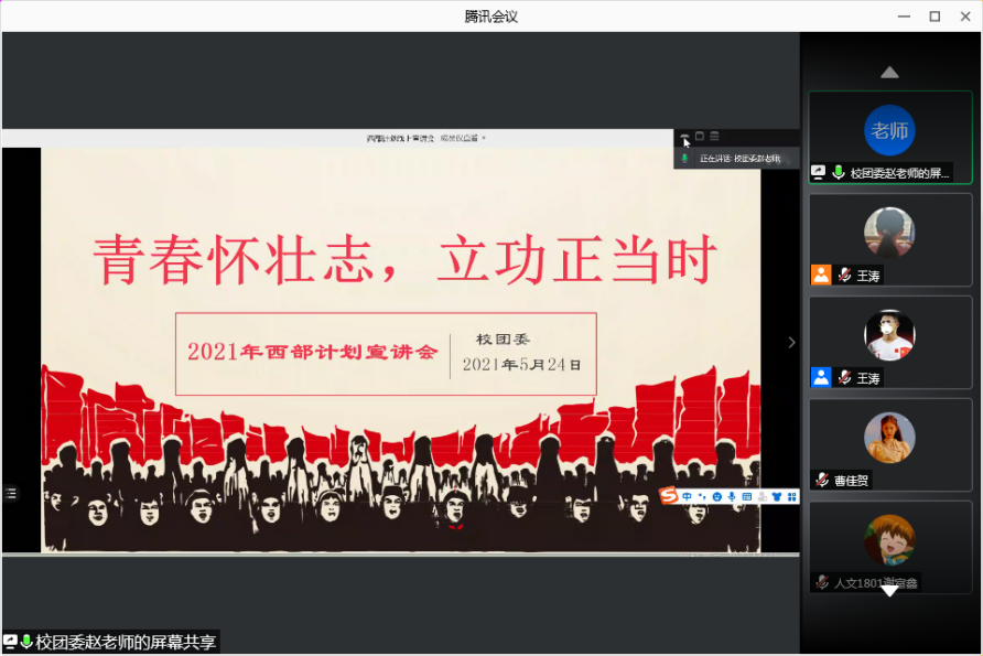 “西部计划”指导教师赵润康老师分别围绕西部计划介绍、招募流程以及为什么要去西部等三个方面对“西部计划”进行了介绍。他鼓励同学们报名参加西部计划招募,西部基层是建功之地,西部计划志愿者经历是成长之路,有助于青年把根深深地扎入祖国大地,在基层实践中吸取成长养分。参加西部计划是幸福之旅,青年志愿者在西部基层艰苦生活的同时,能收获被需要的快乐、被尊重的快乐、被关心的快乐,更加透彻地感悟幸福的真谛。