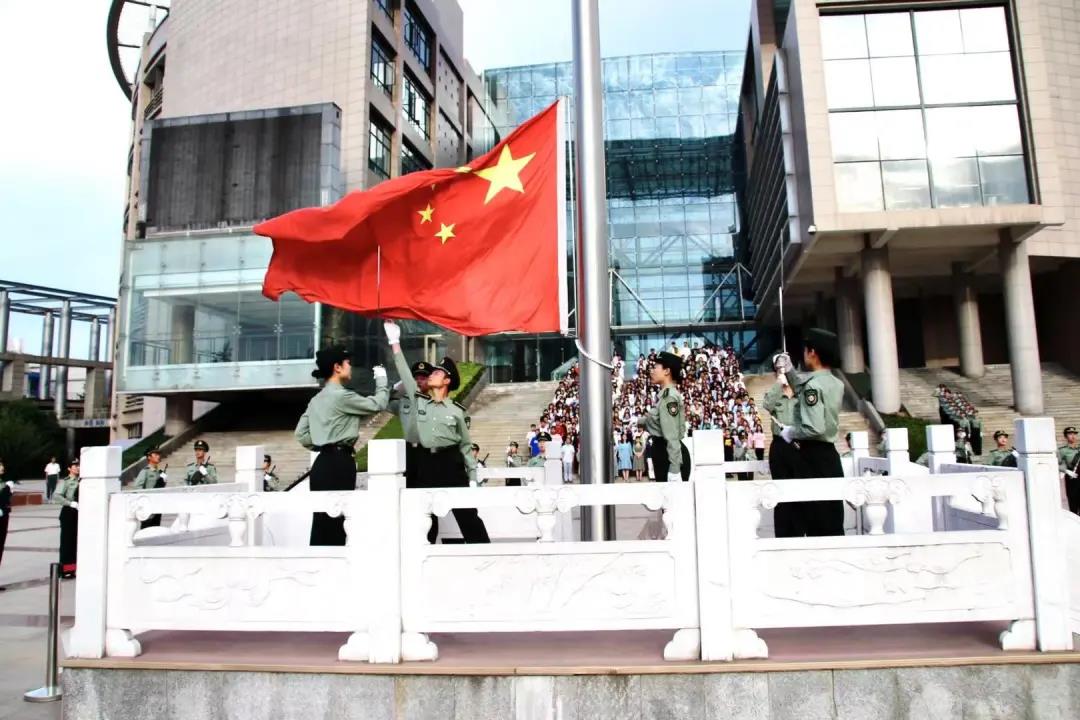 七点零五,国旗护卫队的队员们在《歌唱祖国》的奏乐中,踏着铿锵有力的步伐,护送国旗走向升旗台。伴随着国歌的响起,全体师生庄严肃穆静,行注目礼并齐唱国歌。在嘹亮的歌声中,五星红旗冉冉升起,全体师生怀着崇敬与喜悦的心情,凝视着迎风飘扬的五星红旗。