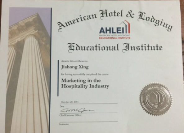 (4)实行“学历教育+国际职业认证”培育方式,专业引入美国饭店业协会职业资格认证体系,学生可获得酒店管理本科毕业证书和AH&LA单科证书或综合管理资格证书;